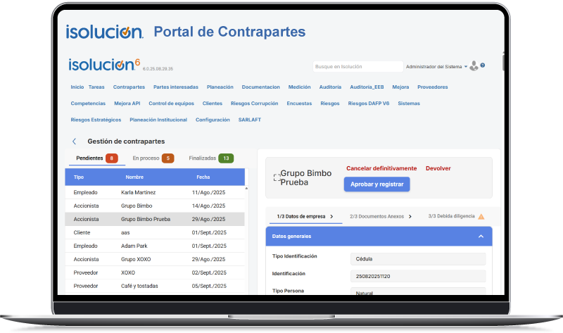 ISOLUCIÓN Portal de Contrapartes es la solución ideal para organizaciones que buscan optimizar el proceso de vinculación de terceros, cumpliendo con normativas como SARLAFT, MIPG, ISO y más. Automatiza la recepción, validación y aprobación de información en un entorno seguro, ágil y centralizado.